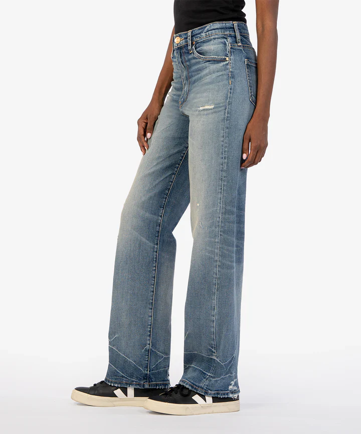 The perfect mix of casual and sophisticated, these high-rise jeans flaunt full-length wide legs that are creased for trouser-inspired style.